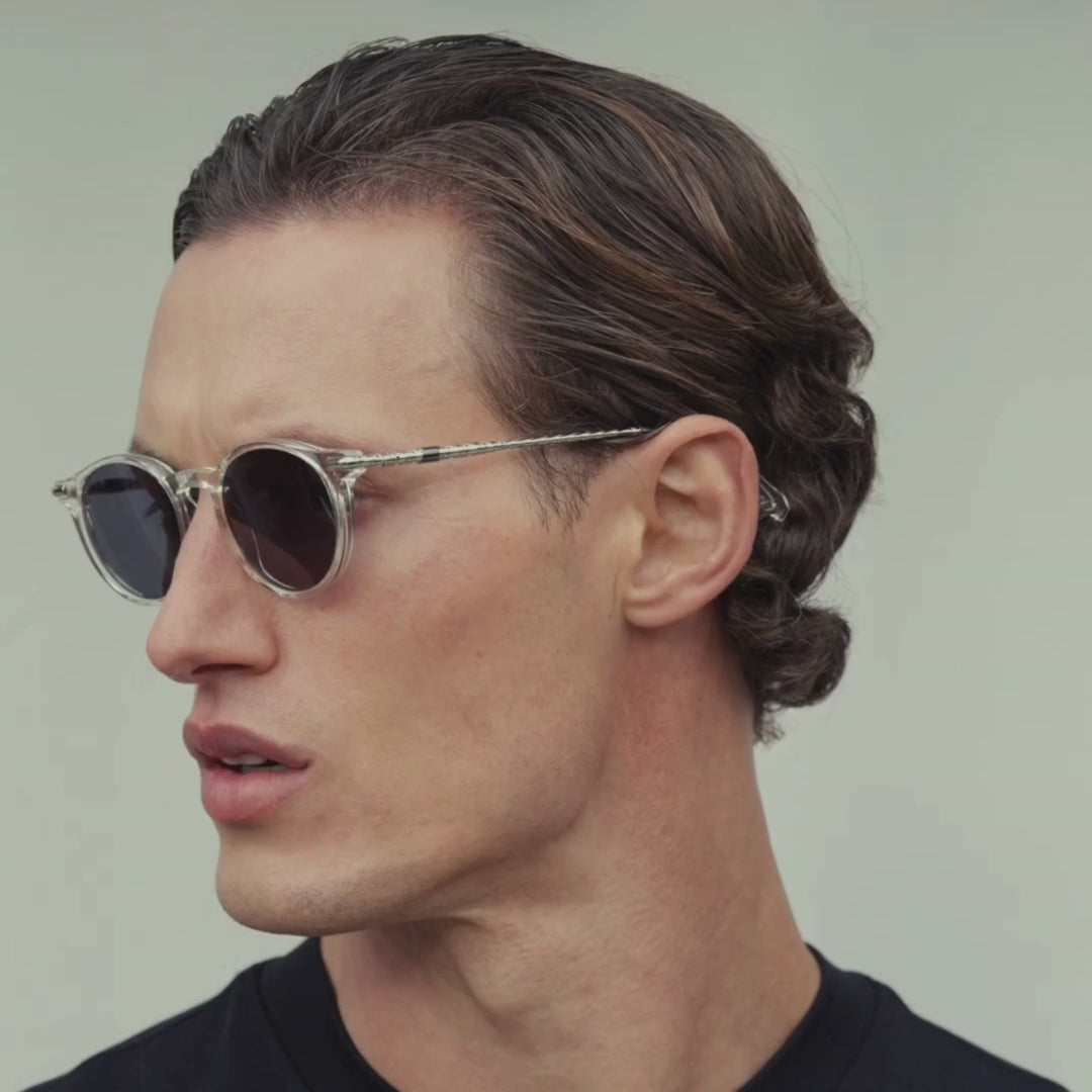 A transparent round frame elevated by dark tinted lenses and finely detailed metal temples. A modern fusion of bold shading and refined craftsmanship, offering a confident statement in clarity and contrast.