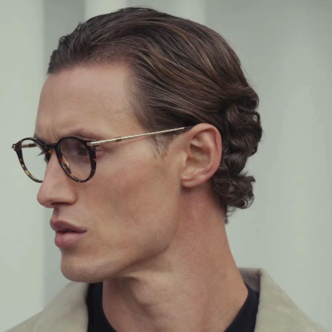 Tortoise acetate shaped into a sleek round silhouette, enhanced by engraved gold metal temples. Featuring clear lenses ideal for screen-heavy days, this design blends effortless sophistication with precise functionality.