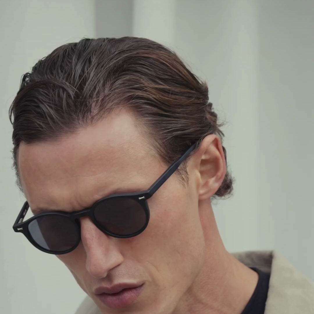 Matte black acetate pairs with dark lenses, anchored by sleek acetate temples. A sophisticated interpretation of shaded elegance, delivering a bold yet timeless look for any setting.